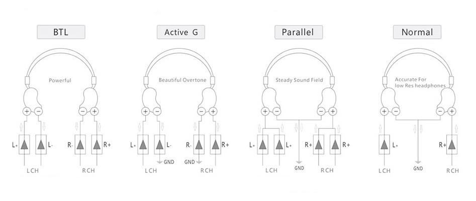 Patru moduri de ieșire vă permit să selectați modul care se potrivește cel mai bine preferințelor dvs. de ascultare sau caracteristicilor căștilor dvs. Modul normal este pentru căști și perechi de căști cu impedanță redusă, iar modul BTL pentru căști cu impedanță ridicată. Modul paralel este eficient pentru căștile cu impedanță medie, crescând forța de acționare, dar nu și amplificarea. În cele din urmă, modul Active Ground, care aduce o senzație mai puternică de armonice, este potrivit în special pentru ascultarea vocii sau a instrumentelor cu coarde, datorită simulării unui „GND virtual”. Acest ultim mod oferă o experiență de ascultare mai blândă și mai caldă.