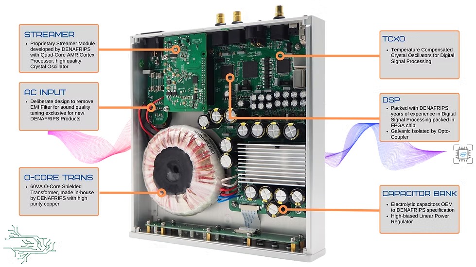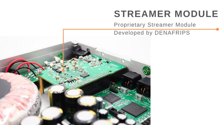 Un modul Streamer unic - dezvoltat intern de inginerii DENAFRIPS - care încorporează un procesor ARM Cortex Quad-Core, oscilatoare de cristal de înaltă calitate, răspuns rapid la tranzitorii LT, zgomot redus și regulatoare LDO.