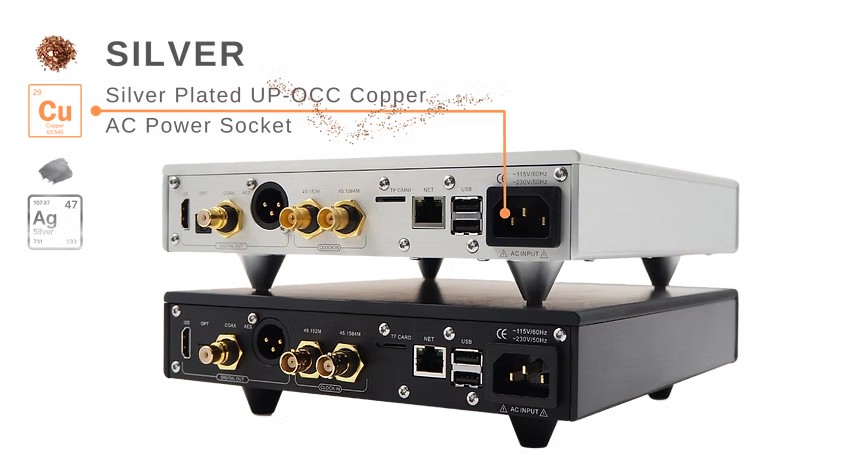 Pentru a atinge acest obiectiv, DENAFRIPS a depus eforturi suplimentare prin personalizarea prizei de alimentare CA interne, folosind cupru placat cu argint UPOCC. În cazul ARCE, o priză de alimentare CA necomutatoare, crezând cu tărie că acest pas va aduce dispozitivul și mai aproape de atingerea unui nivel excepțional de perfecțiune.