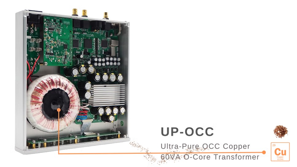 Pe lângă priza de rețea CA placată cu aur UPOCC, ARCE se mândrește cu o îmbunătățire sub forma unui transformator ecranat cu miez O de 60 VA. Acest transformator este realizat meticulos intern de inginerii DENAFRIPS, utilizând cupru UPOCC.