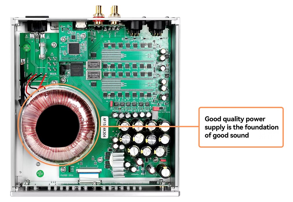 DENAFRIPS înfășoară manual și meticulos transformatorul O-Core supradimensionat, încorporând mai multe straturi de ecranare din cupru între înfășurări. Această alegere de design reduce eficient interferențele electromagnetice (EMI) și câmpurile electromagnetice (EMF).