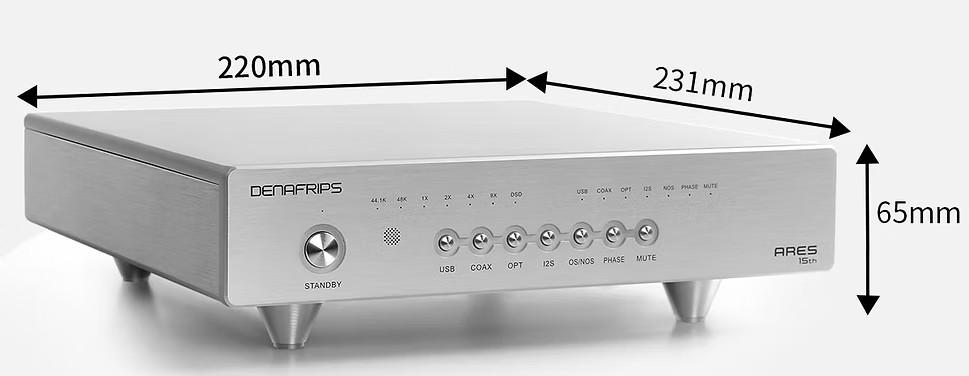 Ares 15th dispune de o secțiune de sursă de alimentare liniară îmbunătățită, care încorporează o bancă de condensatoare marcată „DENAFRIPS”, OEM, în conformitate cu specificațiile DENAFRIPS pentru audio. Pe lângă regulatoarele liniare LDO de curent constant, este fixat în siguranță un radiator mare. Pentru a alimenta FPGA, modulul USB modular și rețelele R-2R Ladder echilibrate, sunt utilizate opt regulatoare liniare LDO multi-etajate.