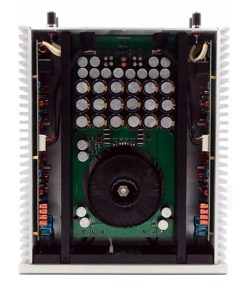 Transformatorul de putere de 300VA este fabricat special pentru audio, cu ecranare din cupru. 18 condensatoare cu rezervor mare (147.600uF) și o diodă Schottky cu acțiune de comutare rapidă, furnizează o sursă de alimentare de curent continuu mai mult decât adecvată amplificatorului modular de putere.