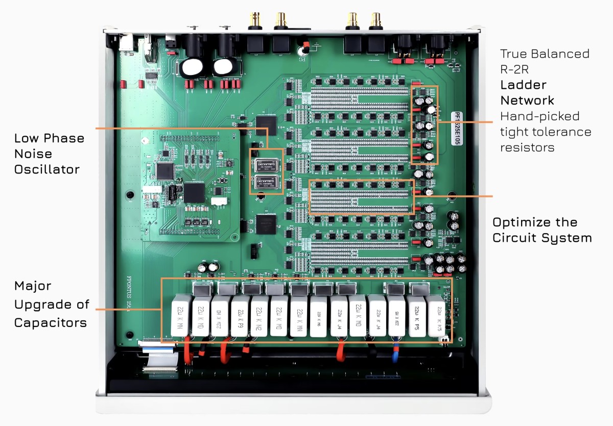 Acest DAC se mândrește cu un design autentic de rețea echilibrată R-2R ladder, fiecare canal fiind echipat cu un CPLD independent de mare viteză. Acesta decodează semnalele digitale prin patru seturi de rețele R-2R 0,005%, asigurând distorsiuni și zgomot de fundal extrem de scăzute în semnalele audio. Fiecare notă rezonează viu și complet, pătrunzând în urechile ascultătorului.
