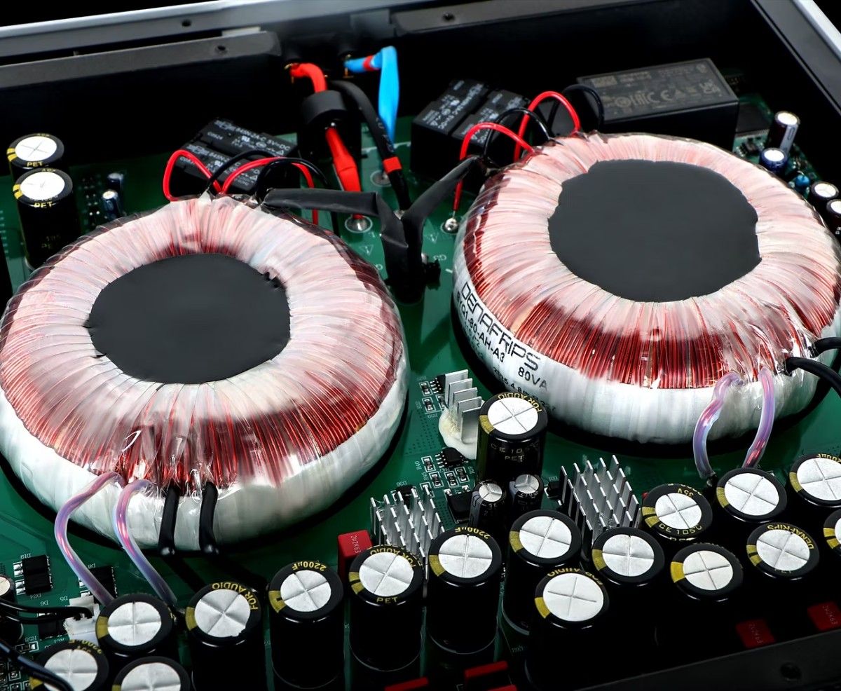 Transformatoare duale O-Core robuste pentru secțiunile digitale și analogice, ESR ultra-scăzut, condensatoare de rezervă cu rezistență mare și sursă de alimentare super liniară în mai multe etape, asigurând o precizie ultra mare și ondulații reduse pentru încărcarea DAC-ului.