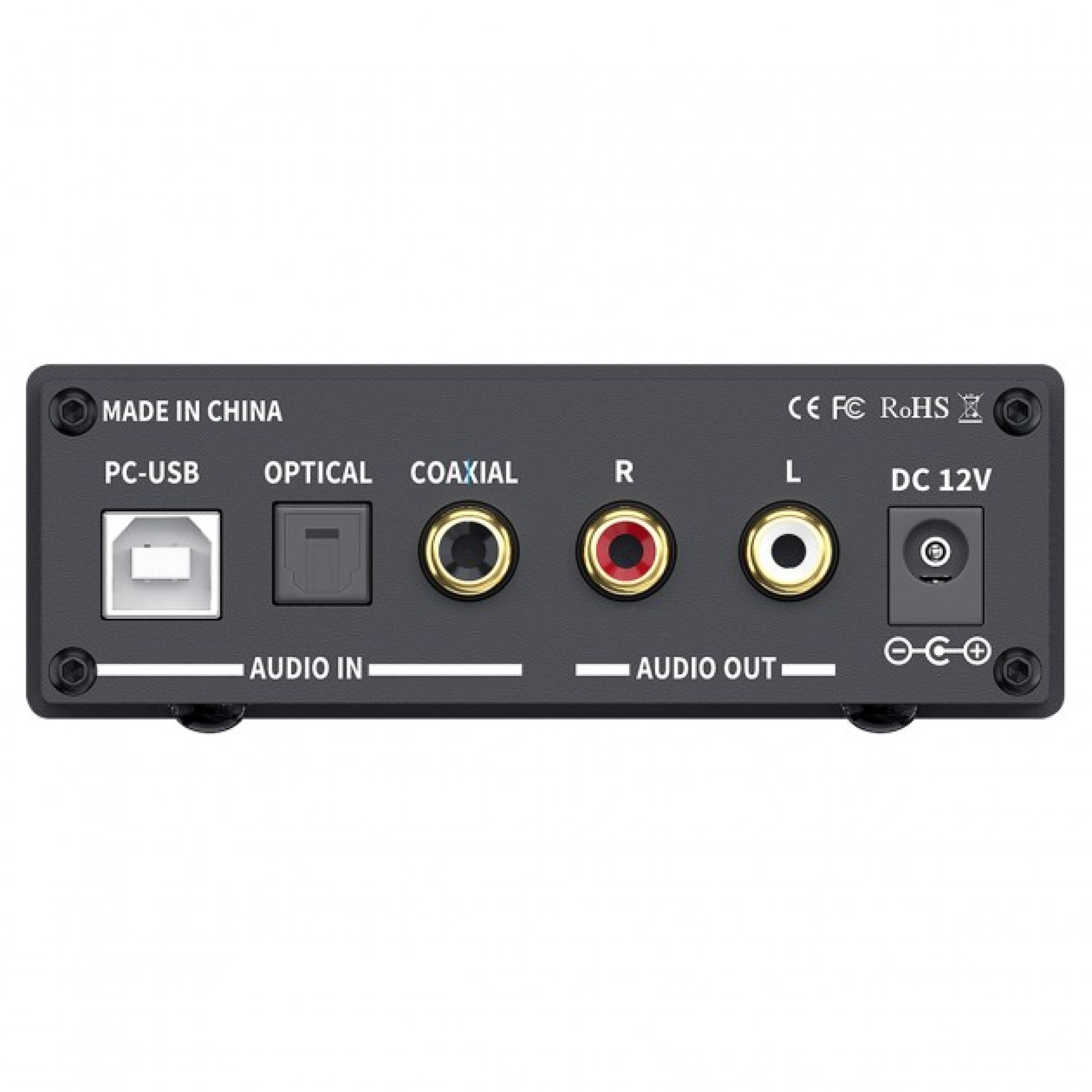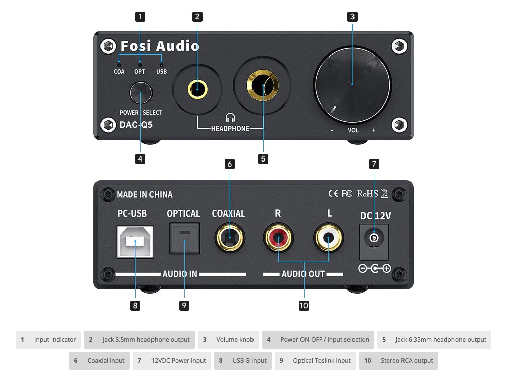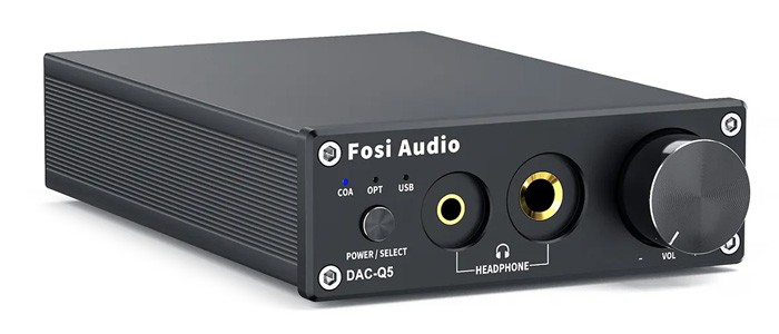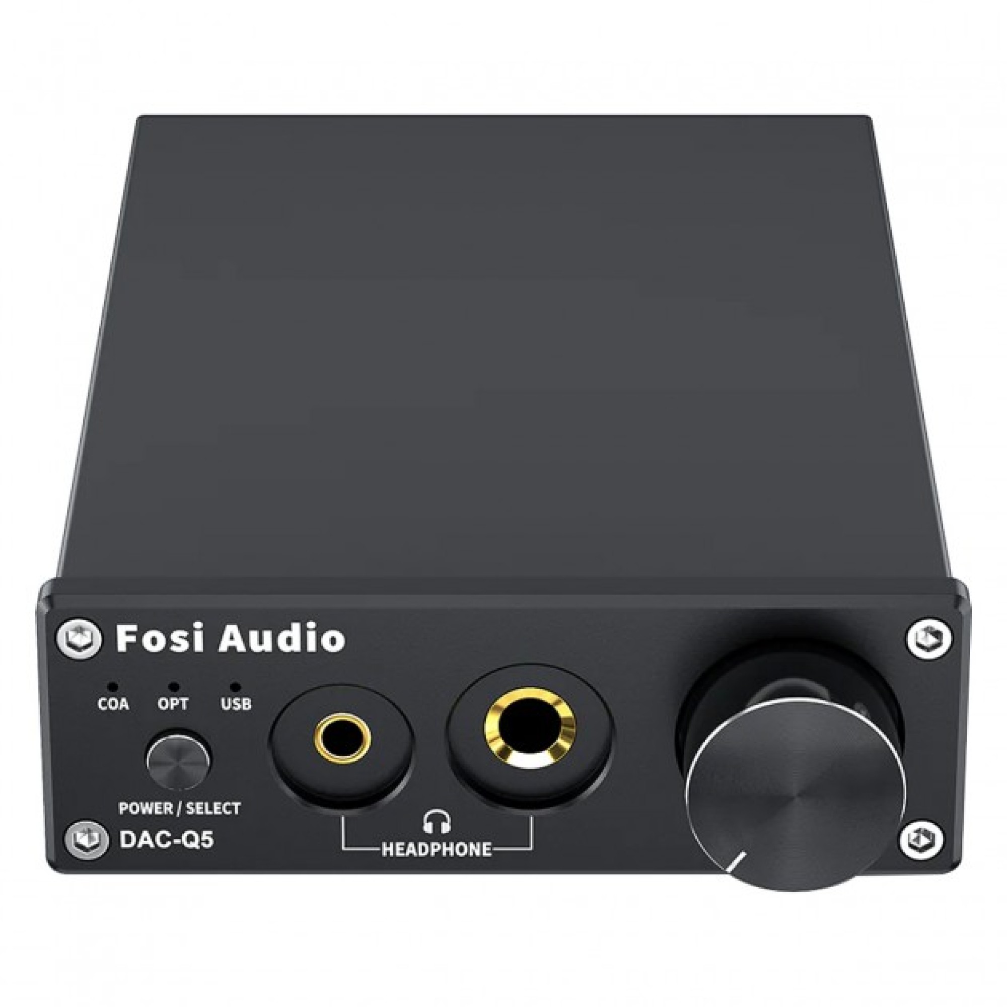 Compact, versatil și accesibil ca preț, Fosi Audio DAC-Q5 preia cu brio rolul de DAC și amplificator pentru căști. Ideal pentru o instalare desktop, se va integra la fel de bine într-un sistem audio mai tradițional. Etajul său de conversie digitală/analogică se bazează pe un cip DAC ESS ES9018K2M, asigurând o decodare de înaltă calitate pentru o reproducere a sunetului bogată și precisă. Este însoțit de un receptor SPDIF MS8416 și o interfață USB SA9123L care acceptă semnale PCM de până la 24 biți 192 kHz. Etajul de amplificare pentru căști al Fosi Audio DAC-Q5 este încredințat unui cip TPA6120 și unor conectori OPA NE5532, permițându-i să dezvolte o putere de 400 mW la 32 Ω. În ceea ce privește conectivitatea, intrările sunt USB-B, optice și coaxiale. Ieșirile sunt fie RCA, fie ieșiri amplificate pentru căști cu conectori Jack 3,5 mm și Jack 6,35 mm.