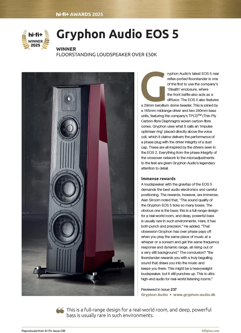 Bazându-se pe tehnologiile revoluționarului EOS 2 de la Gryphon, inginerii Gryphon au acceptat o provocare și mai mare: crearea unui difuzor de referință de ultimă generație care să reflecte etosul și estetica de design a fratelui său mai mic. În ciuda unei înălțimi de doar 1,3 metri, EOS 5 oferă performanțe pe întreaga gamă de frecvențe (20–40.000 Hz, +2 dB) și o capacitate dinamică extraordinară. Atingerea unei astfel de performanțe într-un design compact și vizual a necesitat tehnologii inovatoare.