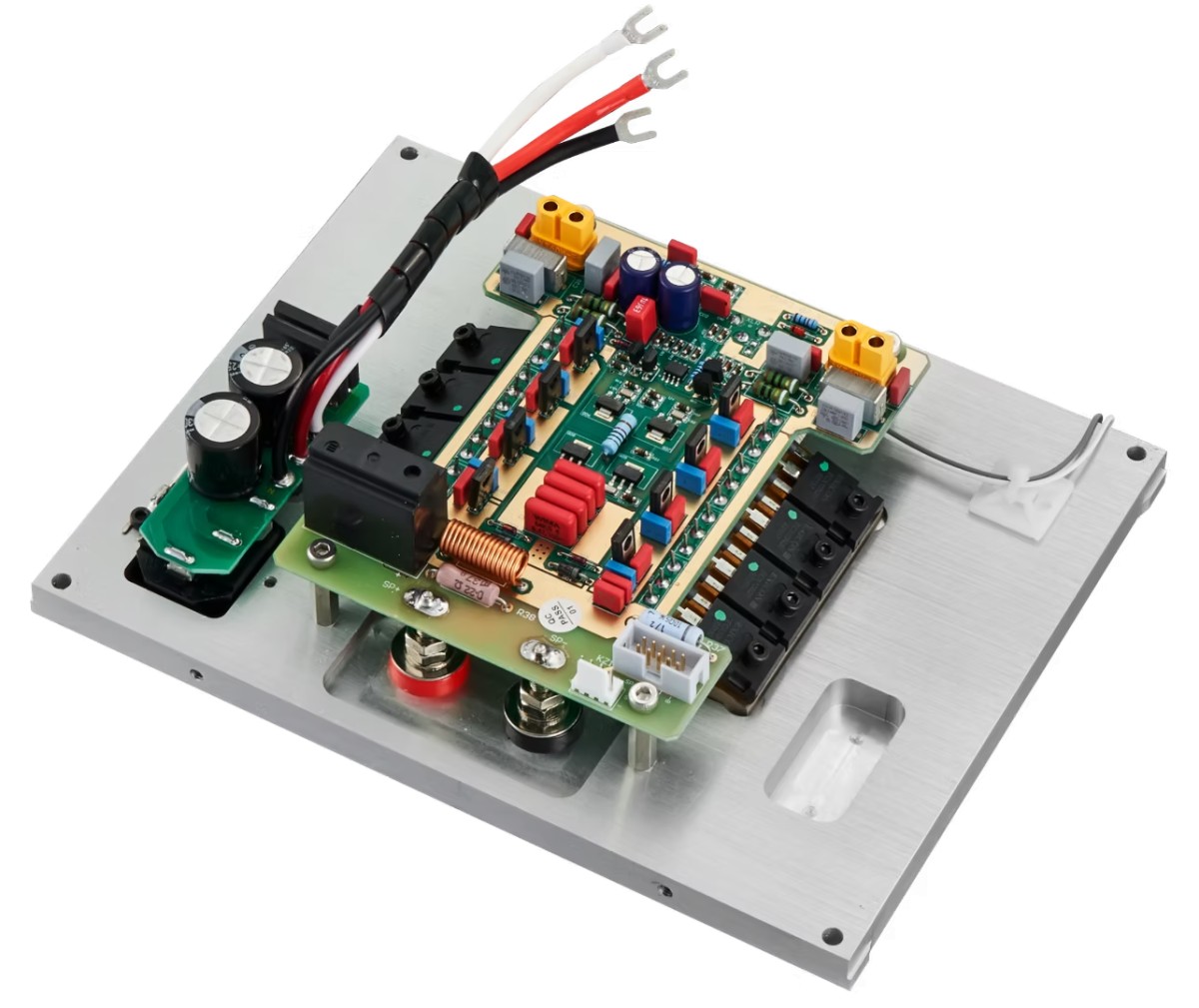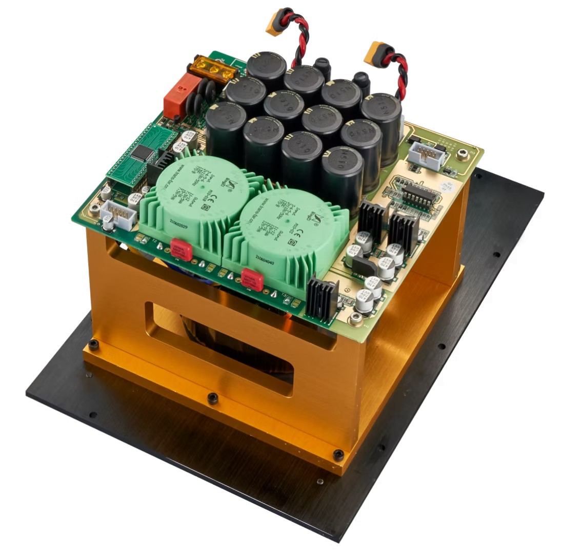 Circuitul de amplificare a puterii dispozitivului este montat direct pe un radiator anodizat auriu, realizat la comandă, asigurând o disipare eficientă a căldurii. Etajul de putere dispune de două perechi de MOSFET-uri EXICON de putere, care sunt acționate în clasa AB pentru a asigura performanțe optime.
