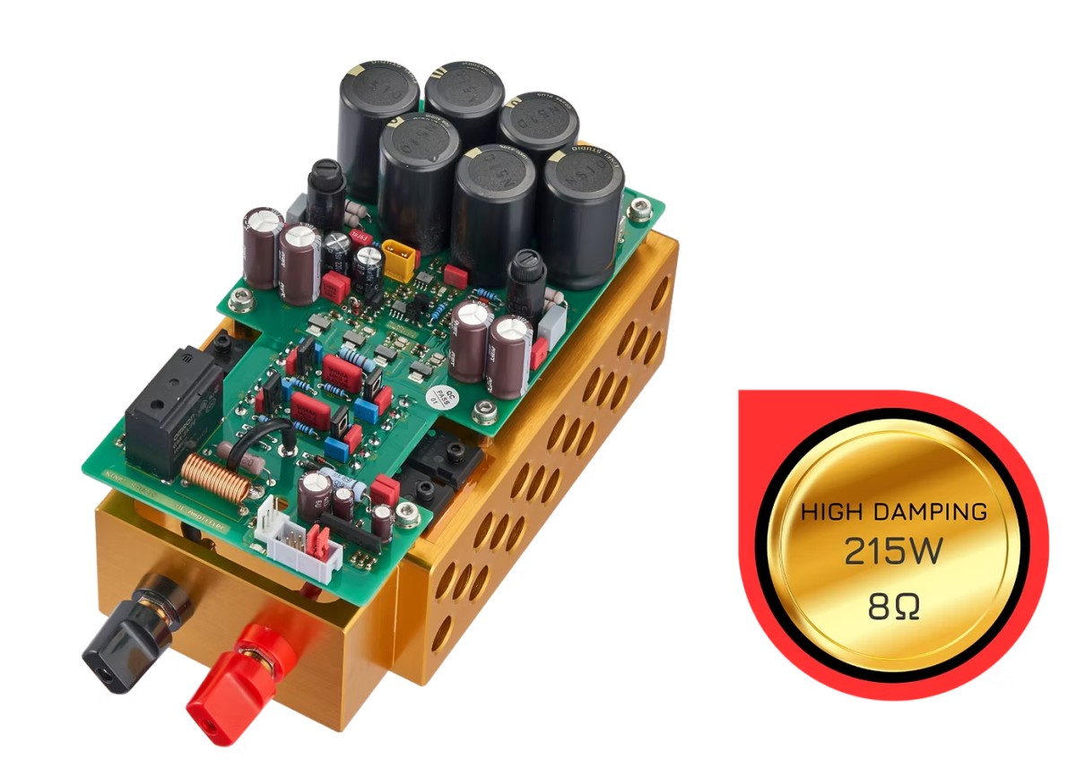 Circuitul de amplificare a puterii dispozitivului este montat direct pe un radiator anodizat auriu, realizat la comandă, asigurând o disipare eficientă a căldurii. Etajul de putere dispune de două perechi de MOSFET-uri EXICON de putere, care sunt acționate în clasa AB pentru a asigura performanțe optime.