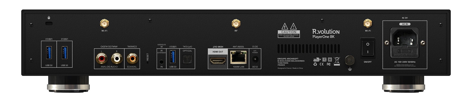 R_volution PlayerOne 8K acceptă majoritatea formatelor audio și video digitale, inclusiv cele mai moderne standarde HDR, cum ar fi Dolby Vision și HDR10+, aproape toate formatele recente de fișiere video, inclusiv MKV, fișiere ISO BD și UHD cu meniuri BD/UHD complete și rapide, codec video AV-1 și HEVC cu un miliard de culori, ieșire HDMI 2.1 8K 60p HDR, fișiere audio de înaltă rezoluție precum DSD, AIFF, FLAC și ALAC și dispune de o carcasă solidă și largă, Auro3D, Dolby Atmos și DTS:X pentru cea mai bună experiență home theater posibilă.