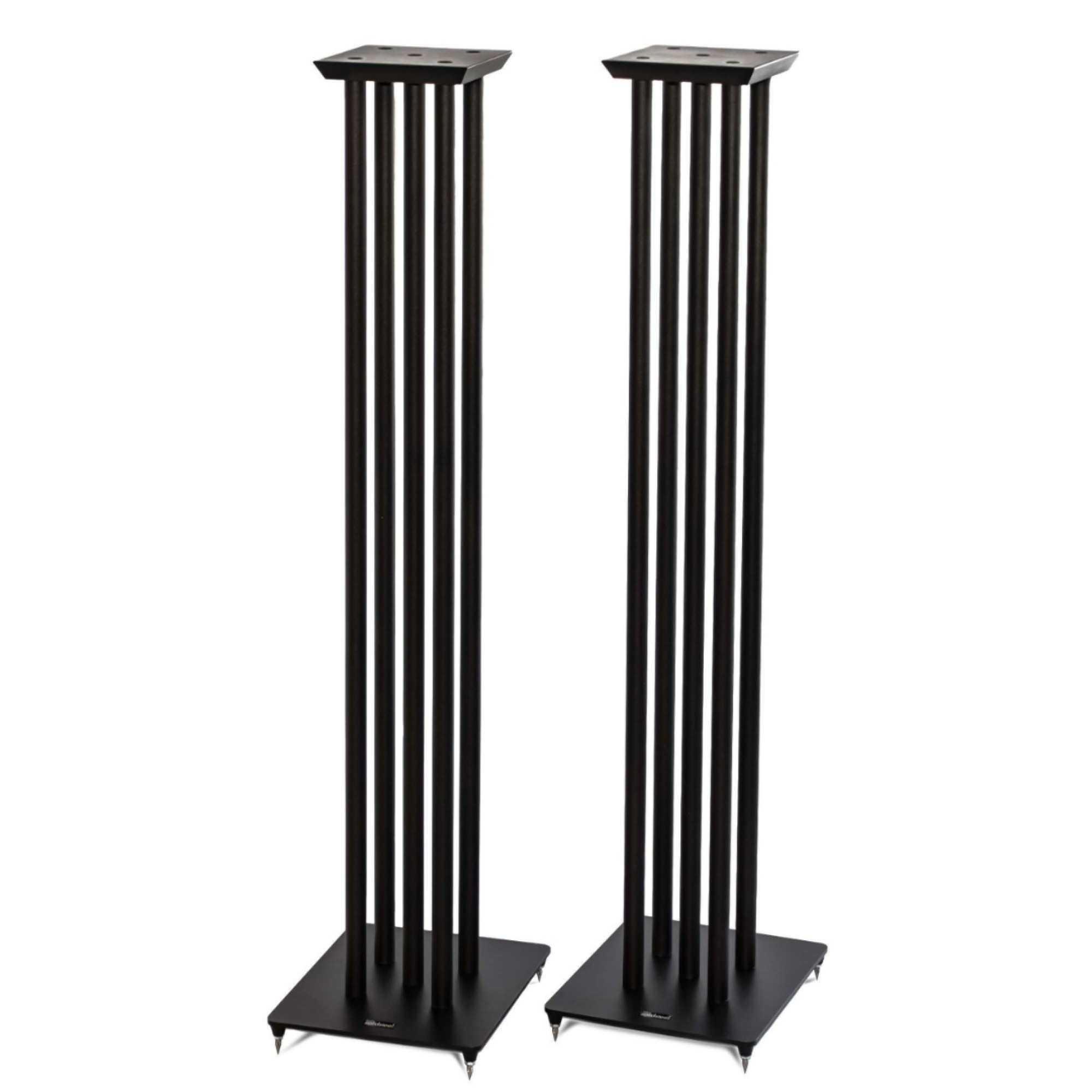 Fiecare suport este realizat din 5 țevi de oțel vopsite fin în negru, înșurubate între o placă superioară din lemn (și vopsită) de 160×160 mm și o placă inferioară grea din oțel inoxidabil, realizată prin tăiere cu laser. Conurile metalice inferioare sunt filetate pentru a susține vârfurile noastre tradiționale din oțel inoxidabil, reglabile pe înălțime. Toate țevile de oțel sunt umplute cu Stratocell®, o folie semirigidă de spumă de polietilenă fonoabsorbantă, care, cu structura sa inovatoare cu celule închise, revoluționează conceptul de corecție acustică. Acest material este de înaltă performanță (cea mai înaltă clasificare de absorbție a sunetului - până la Clasa A) și este perfect pentru amortizarea tuturor vibrațiilor care ar putea fi generate pe suporturi.
